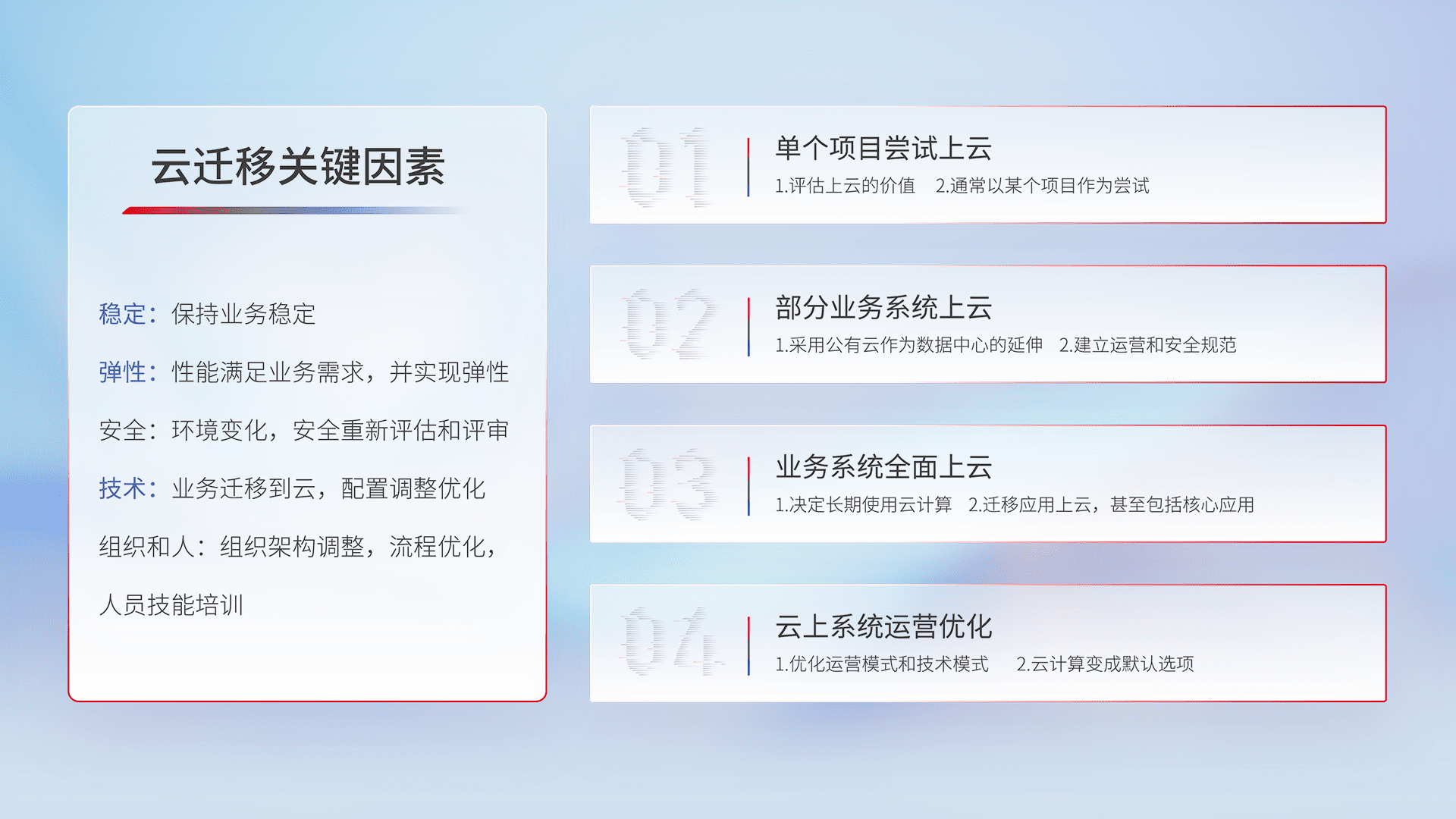 结合实际业务,,,从规划设计、、、、云平台选型、、、、云原生改造、、、数据迁移、、、、集成交付,,,,迁移全过程为客户识别最佳上云路径,,做好风险识别管理,,,设计网络架构、、、身份权限、、、安全审计合规、、操作审计、、、日志审计、、、监控告警策略、、、、多站点容灾设计等,,对云上基础设施进行整体规划,,提升IT治理水平,,以满足弹性、、、、高可用、、高性能的需求。。