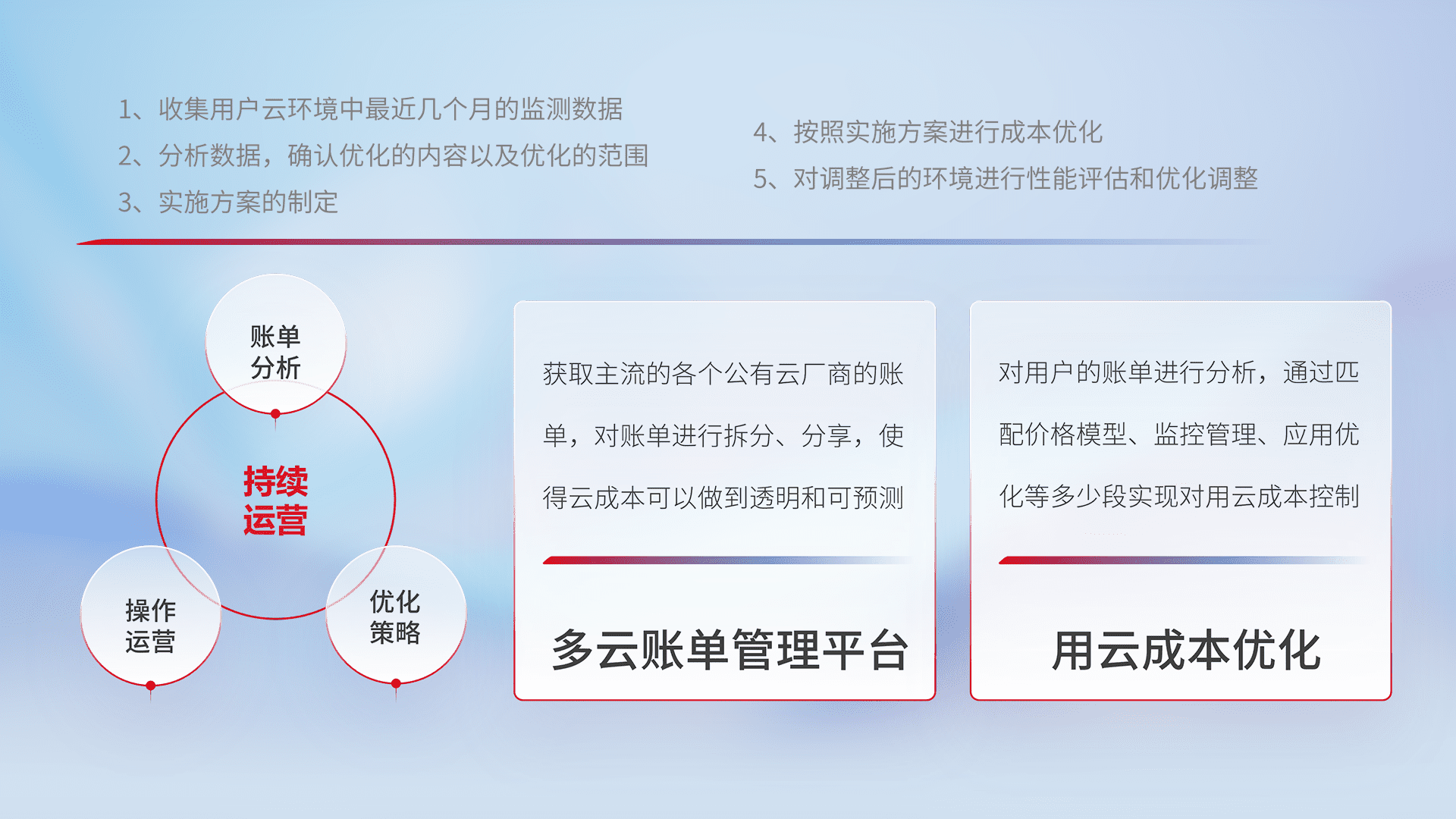 通过多云纳管,,,以统一的资源数据模型把客户的云资源进行抽象和封装,,进而实现对多云资源的统一操作,,,,保障云资源管理的可靠性、、稳定性与可用性。。。。量身定制化运维内容,,,配置、、、开发运维、、、补丁管理、、、备份、、、监控、、、、认证和访问管理、、、审计和日常巡检等,,,,保障在用云过程中的可靠度,,,稳定度以及高可用率。。。。